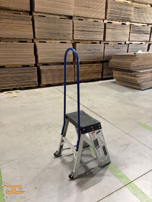 Handle on Wheels Louisville two-step rolling step stool featuring a 53" integrated handrail and a 14" x 12" footprint. The tilt-and-roll wheel configuration allows for rapid repositioning between aisles, while the high-profile handle provides a stable grip point for operators during ascent and descent. This unit is engineered for frequent, low-level picking operations where mobility and secondary points of contact are required for facility safety compliance.