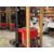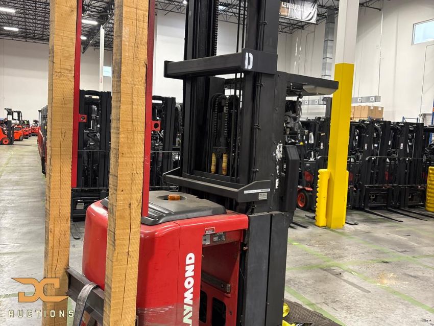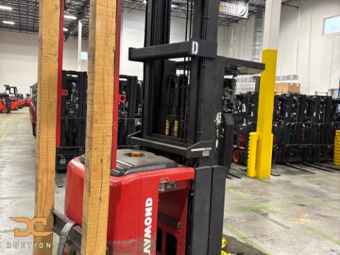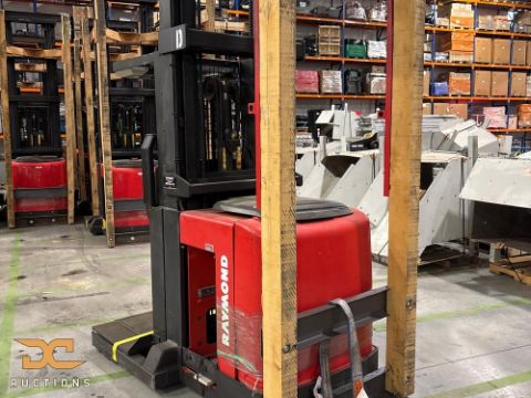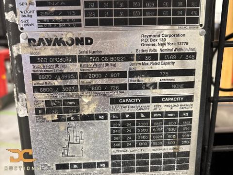Raymond wire-guided order picker, model 560-OPC30TT, year 2006, finished in red and black, with a 3,000 lb capacity and 36V electric power. Features 42" forks, Type E carriage, and cushion tires, with a lowered height of 148" and raised height of 348". Recorded 16,855 deadman hours; engineered for high-reach pallet handling and guided order picking in warehouse operations.