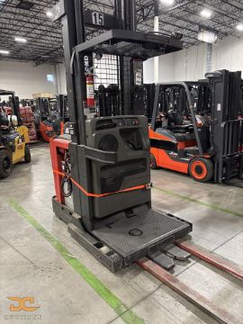 Raymond order picker, model EASI-OPC30TT, year 2005, finished in red and black, with a 3,000 lb capacity and 36V electric power. Equipped with 42" forks, Type E carriage, and cushion tires, with a lowered height of 122" and raised height of 315". Recorded 7,685 key hours and 6,725 deadman hours; designed for high-reach pallet handling and order picking in warehouse operations.