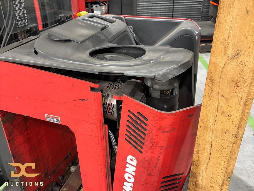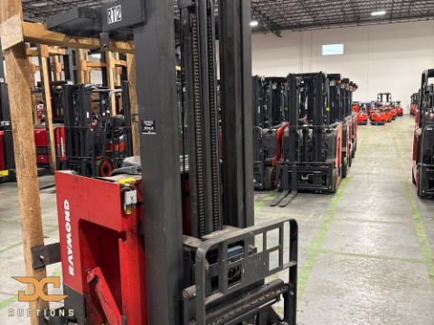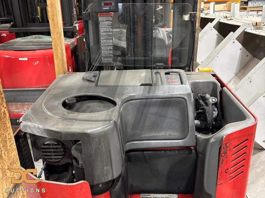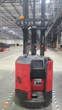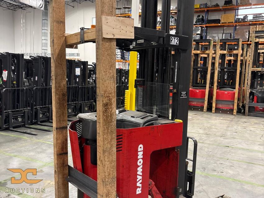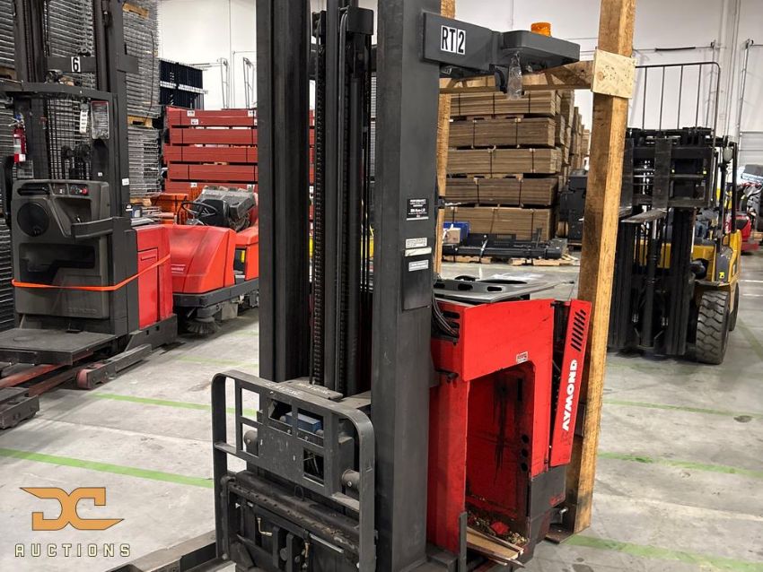 Raymond electric reach truck, model EASI R45TT-M, year 2006, finished in red/black, with a 4,500 lb capacity and 36V power. Features 42" forks, Class 2 (16") carriage, and cushion tires, with a lowered height of 144" and raised height of 321". Engineered for high-reach pallet handling in narrow-aisle warehouse operations.