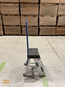 Handle on Wheels Louisville two-step rolling step stool featuring a 53" integrated handrail and a 14" x 12" footprint. The tilt-and-roll wheel configuration allows for rapid repositioning between aisles, while the high-profile handle provides a stable grip point for operators during ascent and descent. This unit is engineered for frequent, low-level picking operations where mobility and secondary points of contact are required for facility safety compliance.