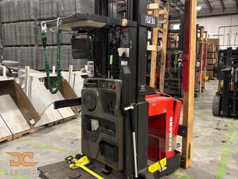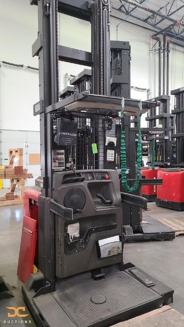 Raymond wire-guided order picker, model 560-OPC30TT, year 2012, finished in red and black, with a 3,000 lb capacity and 36V electric power. Equipped with 42" forks, Type E carriage, and cushion tires, with a lowered height of 148" and raised height of 348". Recorded 11,769 deadman hours; designed for high-reach pallet handling and guided order picking in warehouse operations.