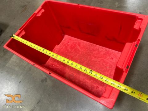 Plastic storage tote measuring 29" long x 19" wide x 15" high, finished in red. Durable molded walls provide structural integrity for stacking or transport. Large footprint accommodates bulk parts, supplies, or materials on shelves, carts, or pallets.