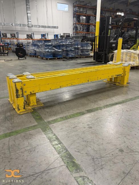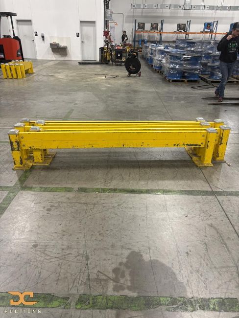 Lot includes five (5) pre-built steel guard rail sections, each approximately 8 feet in length, designed for industrial and warehouse safety applications. Guard rails feature welded construction with integrated posts and base plates intended for floor-mounted installation.