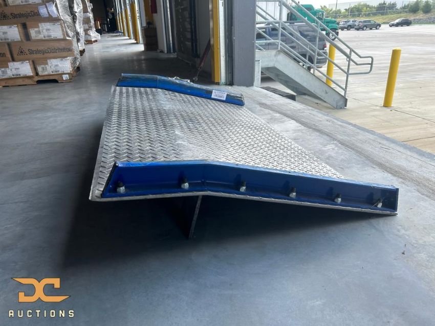 Resting Uline heavy-duty dock ramps measuring 72" x 18" with an 8" rise and a combined 10,000 lb load capacity. Constructed from high-traction aluminum with a resting-lip attachment, these ramps are engineered to bridge height gaps between dock levels and trailers for forklifts and heavy material handling equipment. The 18" width per section provides a stable track for high-capacity throughput while maintaining a portable configuration for rapid deployment at various bay doors.