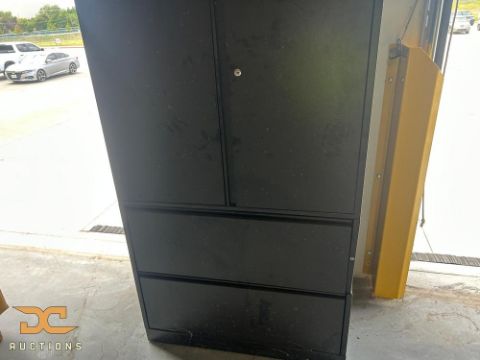 Black utility cabinet assembly measuring 72" long x 18" deep x 24" high and weighing approximately 80 lb. Four-door configuration with two horizontal and two vertical doors provides segregated storage across a single cabinet span. Wide, low-profile layout supports organized storage of tools, supplies, or materials where horizontal reach and access control are required.