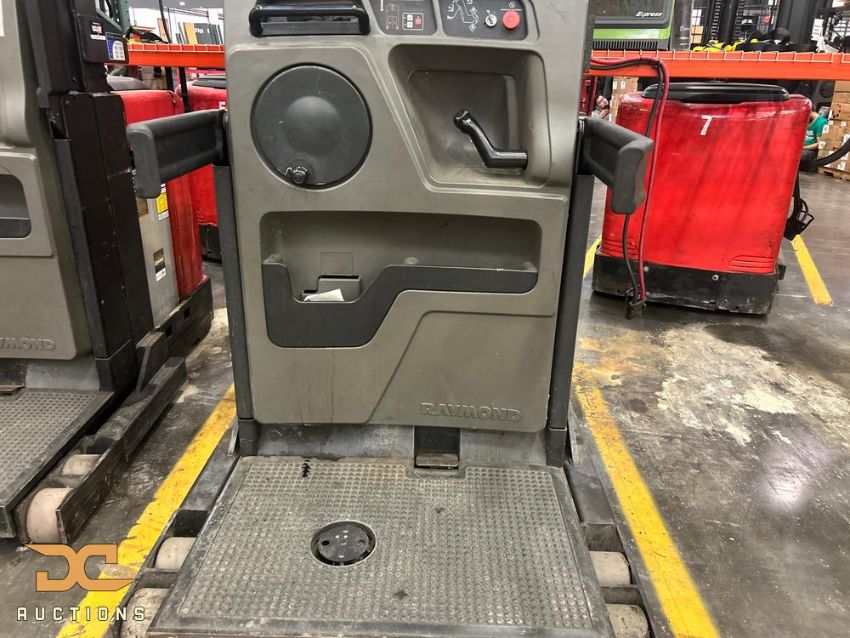 Raymond order picker, model EASI-OPC30TT, year 2004, finished in red and black, with a 3,000 lb capacity and 36V electric power. Features 42" forks, Type E carriage, and cushion tires, with a lowered height of 122" and raised height of 315". Recorded 4,357 key hours and 1,913 deadman hours; engineered for high-reach pallet handling and order picking in warehouse environments.