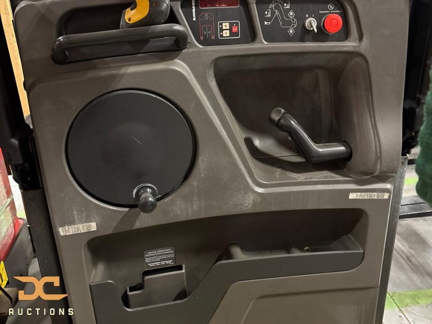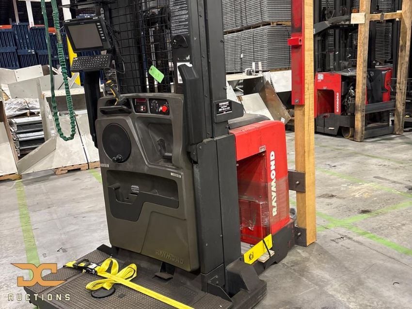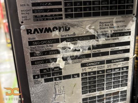Raymond wire-guided order picker, model 560-OPC30TT, year 2006, finished in red and black, with a 3,000 lb capacity and 36V electric power. Features 42" forks, Type E carriage, and cushion tires, with a lowered height of 148" and raised height of 348". Recorded 17,188 deadman hours; engineered for high-reach pallet handling and guided order picking in warehouse operations.