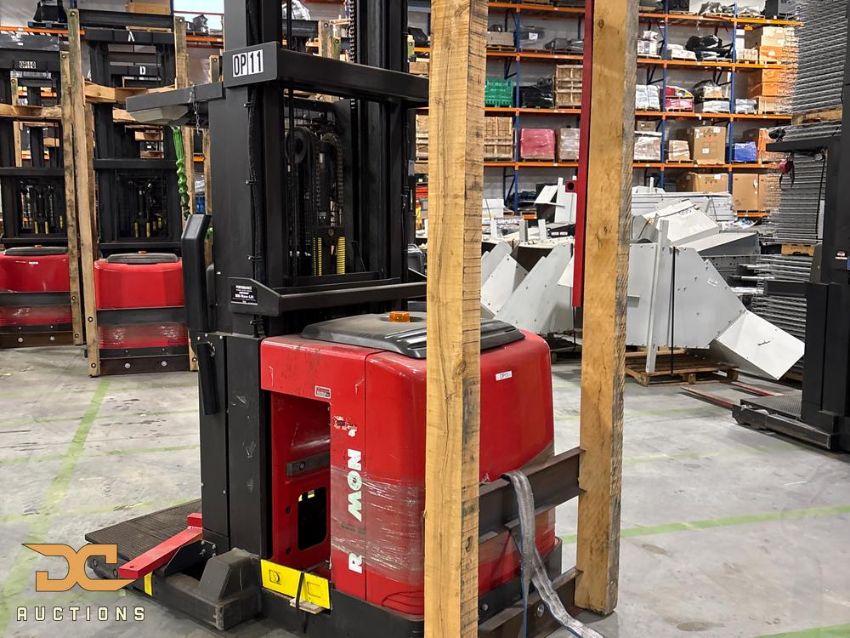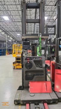 Raymond wire-guided order picker, model 560-OPC30TT, year 2010, finished in red and black, with a 3,000 lb capacity and 36V electric power. Features 42" forks, Type E carriage, and cushion tires, with a lowered height of 148" and raised height of 348". Recorded 13,861 deadman hours; engineered for high-reach pallet handling and guided order picking in warehouse operations.