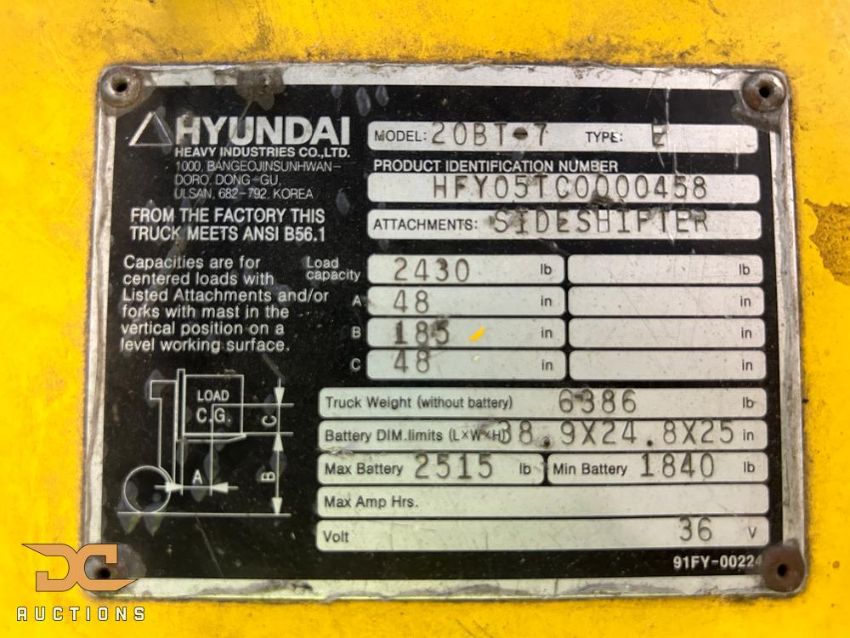 Hyundai sit-down electric forklift, model 20BT-7, finished in yellow, with a 2,430 lb capacity and 36V power. Features 48" forks with sideshifter, Type E carriage, and cushion tires, with a lowered height of 7' and raised height of 185". Recorded 3,673 deadman hours; engineered for precise pallet handling and material positioning in warehouse or production environments.