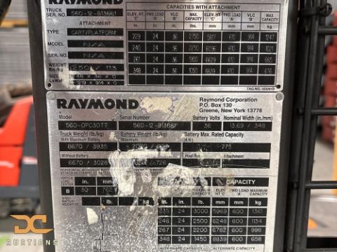 Raymond wire-guided order picker, model 560-OPC30TT, year 2012, finished in red and black, with a 3,000 lb capacity and 36V electric power. Features 42" forks, Type E carriage, and cushion tires, with a lowered height of 148" and raised height of 348". Recorded 11,646 deadman hours; engineered for high-reach pallet handling and guided order picking in warehouse operations.