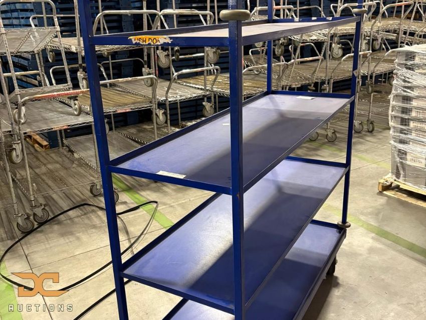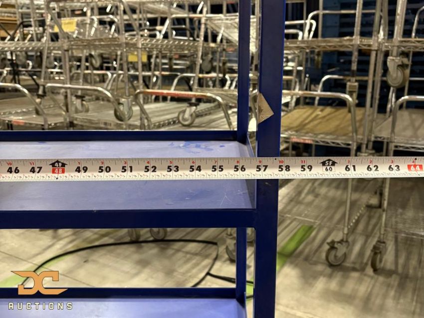 Uline 4-shelf rolling service cart finished in blue, featuring a durable steel or heavy-duty plastic construction designed for versatile warehouse and office transport. The four-tier shelf configuration maximizes vertical storage capacity for small to medium-sized items, while the integrated casters provide easy maneuverability across flat surfaces. This unit is engineered for organized item distribution and order picking, offering a reliable mobile solution for high-traffic industrial environments.