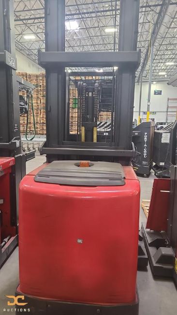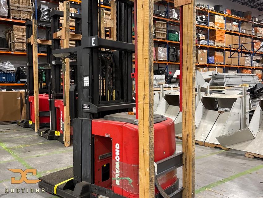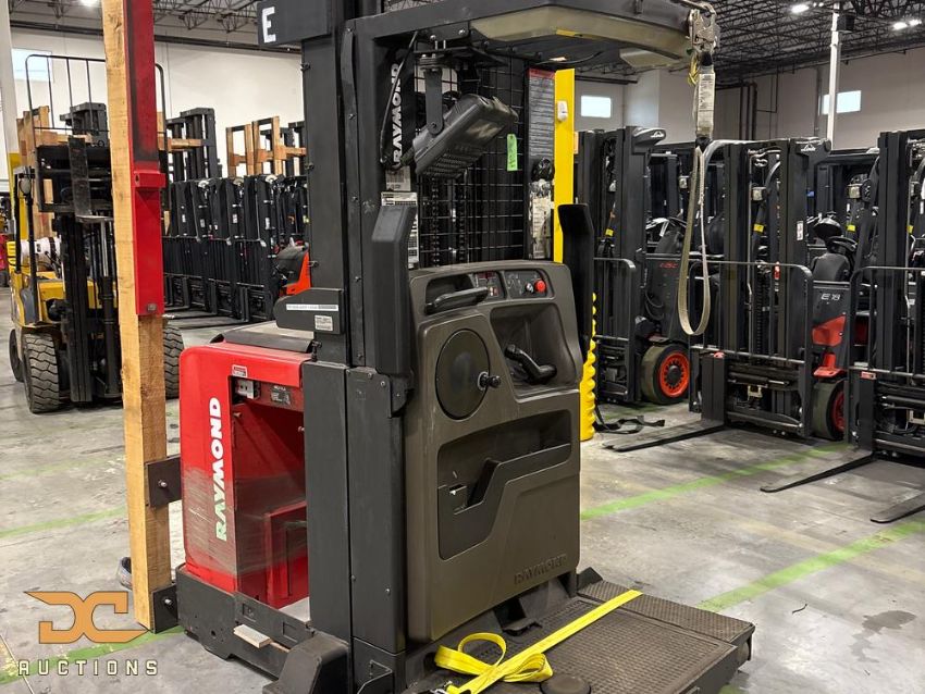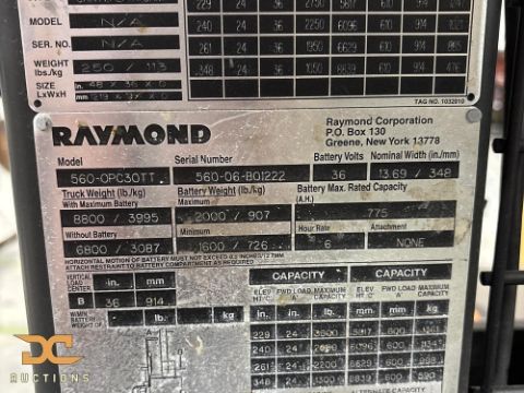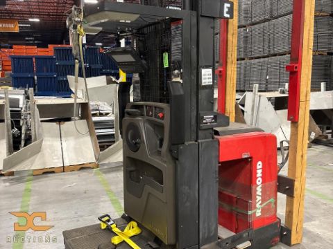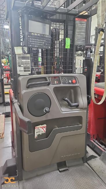 Raymond wire-guided order picker, model 560-OPC30TT, year 2006, finished in red and black, with a 3,000 lb capacity and 36V electric power. Equipped with 42" forks, Type E carriage, and cushion tires, with a lowered height of 148" and raised height of 348". Recorded 14,916 deadman hours; designed for high-reach pallet handling and guided order picking in warehouse operations.