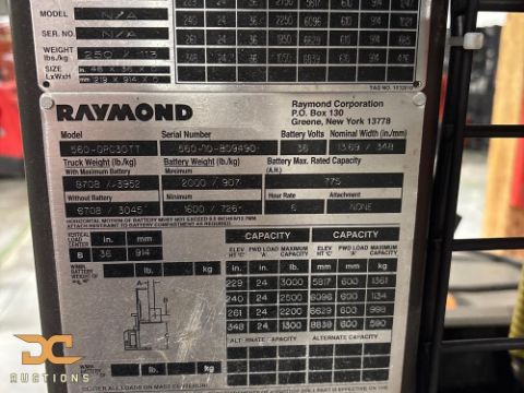 (1) 2010 Raymond Order Picker | Wire Guided *Battery Included* Attachment Type: Forks Capacity: 3,000 lbs. Color: Red/Black Deadman Hours: 13,793 Fork Length: 42" Fuel: Electric Height Lowered: 148" Height Raised: 348" Make: Raymond Model: 560-OPC30TT Tire: Cushion Unit No: OP1 Voltage: 36 Volt Year: 2010 Carriage Class: Type E MSRP: $45,000 Loading Fee: $250 Raymond wire-guided order picker, model 560-OPC30TT, year 2010, finished in red and black, with a 3,000 lb capacity and 36V electric power. Equipped with 42" forks, Type E carriage, and cushion tires, with a lowered height of 148" and raised height of 348". Recorded 13,793 deadman hours; designed for high-reach pallet handling and guided order picking in warehouse operations. Battery Included: 36 volt Make: Enersys Model: 125P-11 Year: 2014 Length: 38" Width: 13.5" Height: 30.5" Capacity: 625 AH@C6 Voltage: 36 Volt Color: Gray EnerSys Ironclad 12-125P-11 lead-acid forklift battery rated for 625 Ah at a 6-hour discharge rate. This 36V unit measures 38" x 13.5" x 30.5" and utilizes a 12-cell configuration for standard electric material handling applications. The square-tube positive plate design provides consistent power delivery for multi-shift warehouse operations requiring high amp-hour capacity. Battery GPID: BBB-LASV1-1-00052
