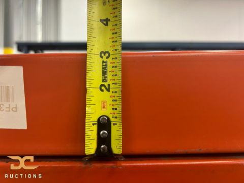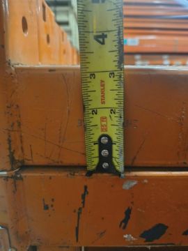 Provo-Craft roll-formed teardrop pallet rack beam measuring 96" long with a 3" face height, finished in orange. Equipped with a 3-hole teardrop connector for attachment to compatible uprights. Used as a horizontal load support member in compatible teardrop rack systems for standard pallet storage applications.