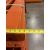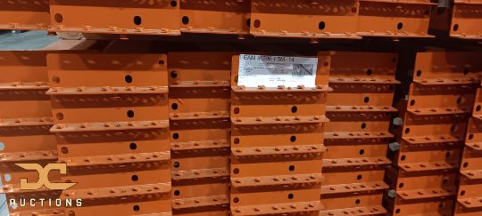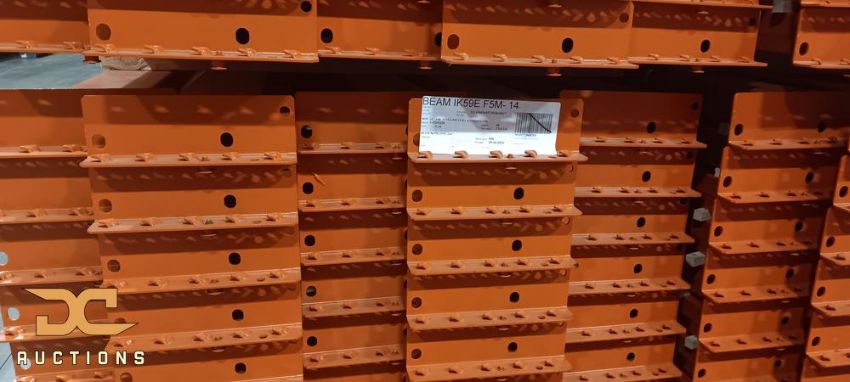 Interlake Mecalux teardrop pallet rack beam model IK59E F5M measuring 144" long with a 5-15/16" face, finished in orange. Equipped with a 10" teardrop connector using a 5-hole clip for attachment to compatible uprights. Used as a primary load beam in teardrop rack systems to support palletized or decked loads across wide bay openings