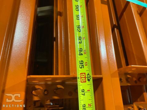 Mecalux teardrop pallet rack beam measuring 96" long with a 2-3/4" face, finished in orange. Equipped with a 3-hole teardrop clip connection for secure attachment to compatible Mecalux uprights. Used as a horizontal load beam in teardrop rack systems to support palletized or decked loads across standard bay widths.