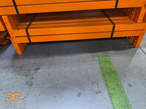 Pallet rack beams measuring 48" long by 2-1/2" wide, finished in orange. Equipped with an 8" 6-hole, 3-clip baseplate for secure attachment to compatible uprights. Designed to provide horizontal load support and maintain structural stability in warehouse racking systems.