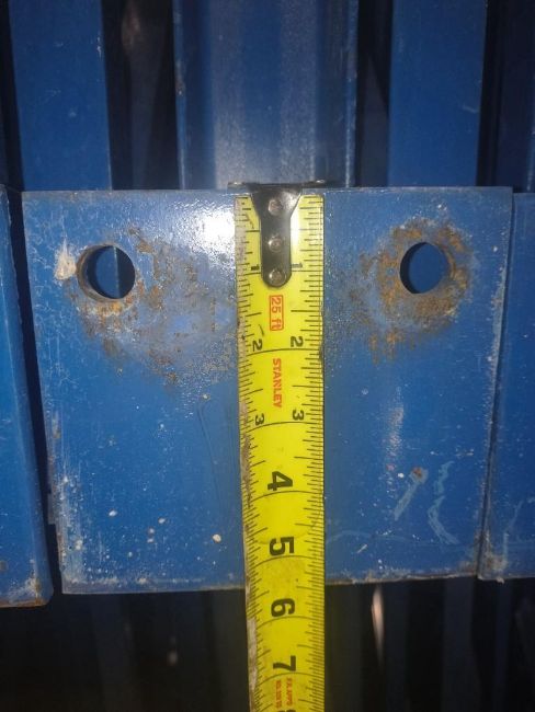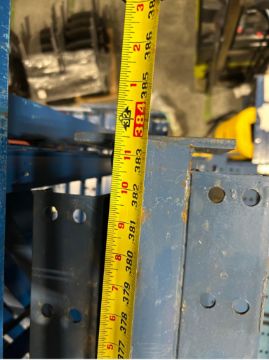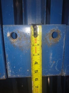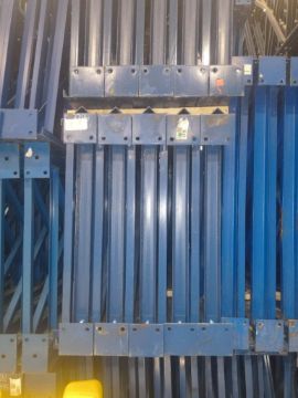 Frazier C3 pallet rack column measuring 32' tall with a 42" frame depth, finished in blue. Constructed with a 3" profile and equipped with a 5-1/2" x 6" two-hole anchor baseplate, and includes an 18" bolt-on column guard for lower-upright protection. Designed as a vertical load-bearing member for Frazier rack systems in high-bay warehouse storage installations.