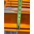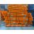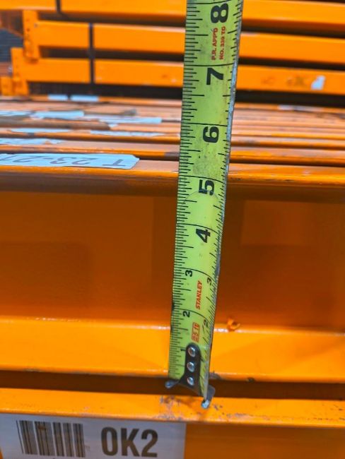 Hannibal hybrid reversed C-channel pallet rack beam measuring 96" long with a 5" face and a 5" profile height, finished in orange. Equipped with an 8" wide, 4-hole clip connection featuring a 1" drop for stepped beam elevation. Used in rack bays where specific elevation offsets or pallet flow and support components require a dropped beam interface.