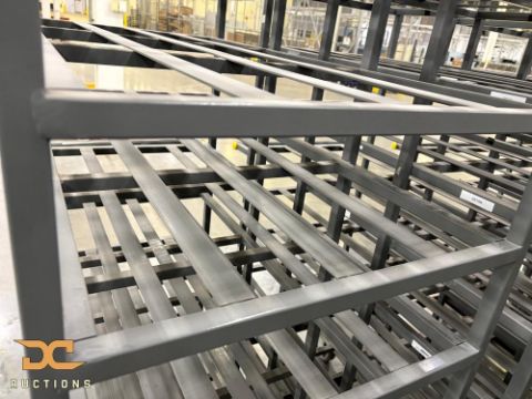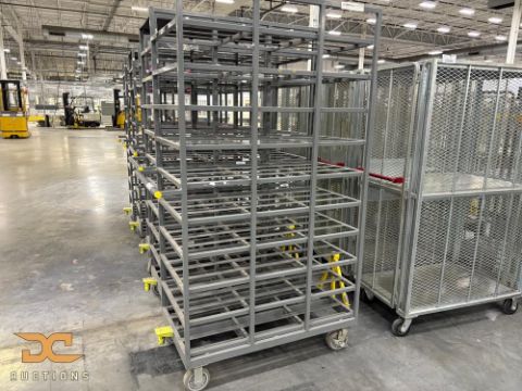 Ten-level tugger cart with graded shelves and integrated handle. Designed for high-density part movement and sequencing in warehouse and manufacturing settings. Optimized for tugger train applications.