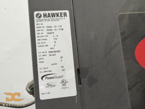 Hawker 24-volt industrial battery charger, model PH3R-12-775, rated for 775 amp-hour battery systems and configured for hardwired 480-volt input power. Designed for charging 24-volt forklift batteries in dedicated battery rooms with high-voltage infrastructure. Commonly used in warehouse operations running standardized Hawker lift truck battery setups.