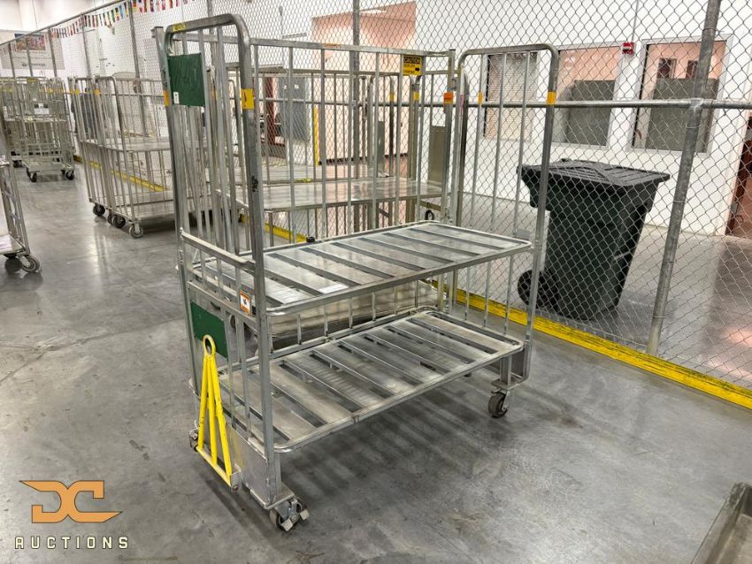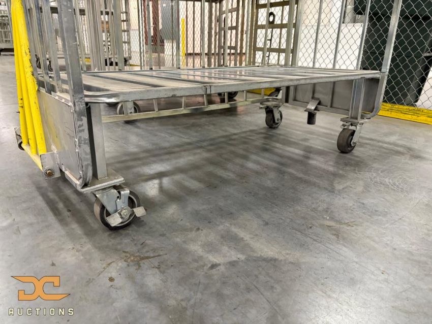 Canon wheel tugger cart model ETFZLG featuring a double-level layout with a grated top, measuring 56" long by 29" wide and standing 69" tall with a 2,000 lb capacity. Designed for staged transport and storage of wheels or heavy components in tugger and material flow systems. Commonly used in production and warehouse environments to keep parts organized while supporting repeated movement along fixed routes.