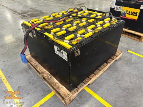 48-volt industrial forklift battery manufactured by ASH, model 024085F23, rated at 935 amp-hours at C6 and weighing approximately 3,526 lbs. Sized at 38" x 36" x 23", this battery is designed for high-demand electric lift trucks requiring long run times. Commonly used in multi-shift warehouse operations where sustained power output is critical.