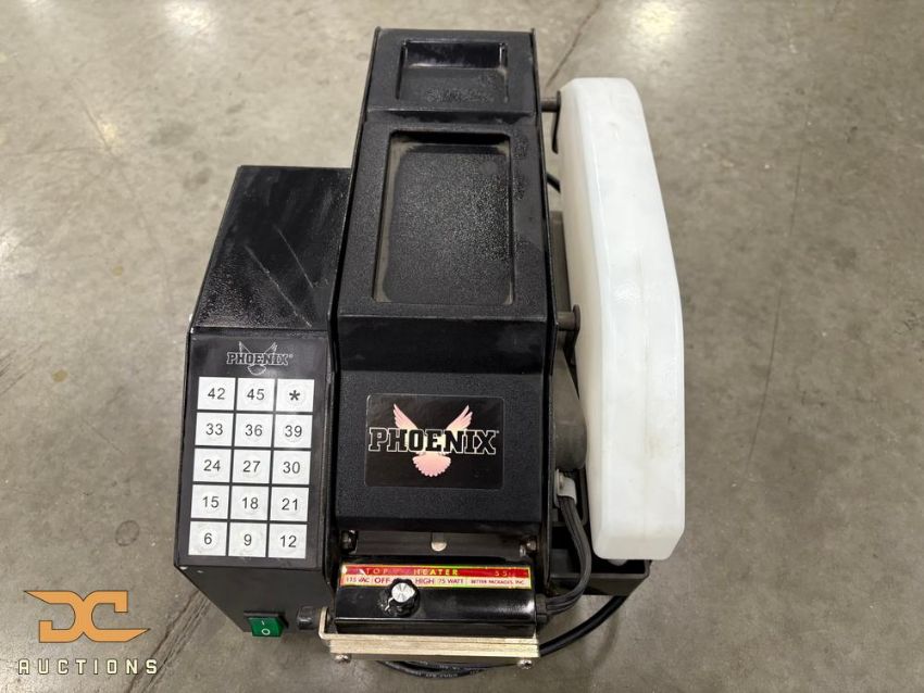 Phoenix wet tape dispenser model E1 operating on 120 volts. Desktop wet taping unit designed for carton sealing in warehouse packing stations. Commonly used for reinforced paper tape applications.