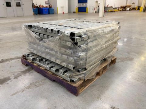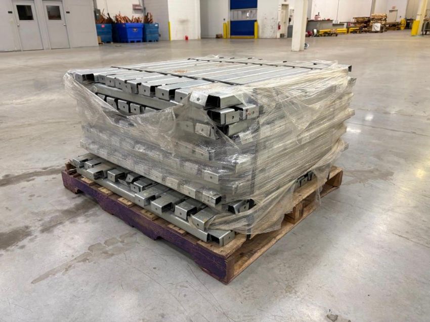 Pallet rack pallet supports measuring 42" long with a 3" x 3" profile, finished in grey. Designed with a 2-hole screw-in outside waterfall configuration that fastens directly to the face of the beam. Used to provide added load support for pallets, cartons, or decking in rack bays where additional mid-span reinforcement is required.