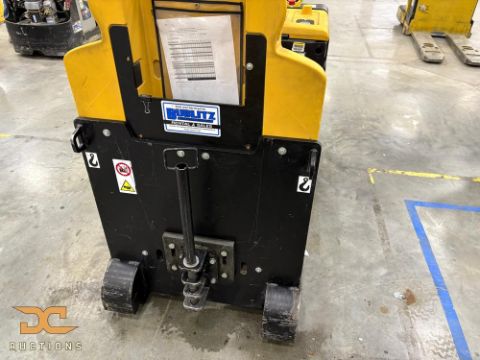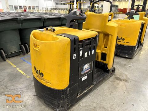 Yale electric tugger model MO50T with a 5,000 lb towing capacity and cart attachment setup. Designed to move multiple carts efficiently across warehouse floors. Ideal for operations implementing tugger train systems.