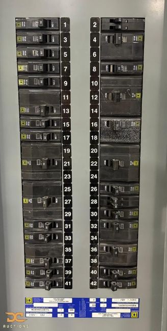Square D breaker panel model MHC77VS with a full 42-breaker configuration, rated up to 240 volts and 400 amps. Tall enclosure measuring 77" high, designed for centralized electrical distribution in industrial and warehouse facilities. Commonly used as a main or sub-panel where high circuit density is required.