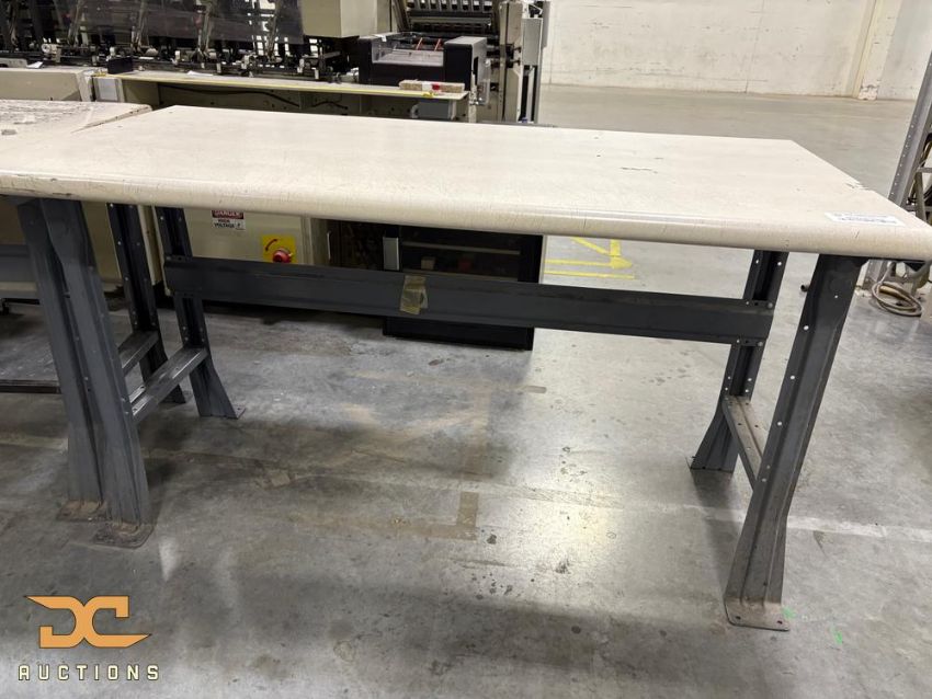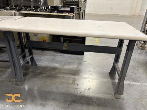 Workstation table measuring 60" long by 30" wide and 34" high, providing a compact work surface suited for assembly, packing, or light fabrication tasks. The elevated height supports standing work applications and efficient operator access. Commonly used in warehouse and production areas where space-efficient workstations are required.