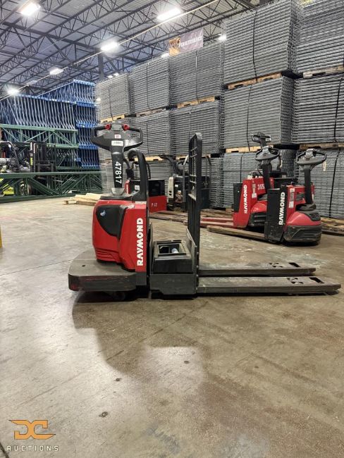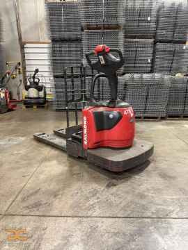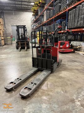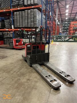 Raymond 8410 walkie rider. Designed for material movement within warehouse and distribution environments. Commonly used for transporting palletized loads in facility settings. Battery included.