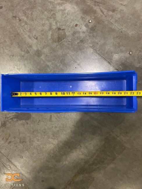 Stackable blue storage totes measuring approximately 22" x 5" x 6". Commonly used for organizing and storing smaller parts or inventory within warehouse, retail, or facility settings. Designed for placement on shelving, workstations, or storage systems.